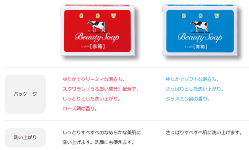 牛乳石鹸青箱はさっぱり、赤箱はうるおい成分の「スクワラン」配合でしっとりの洗い上がりです。